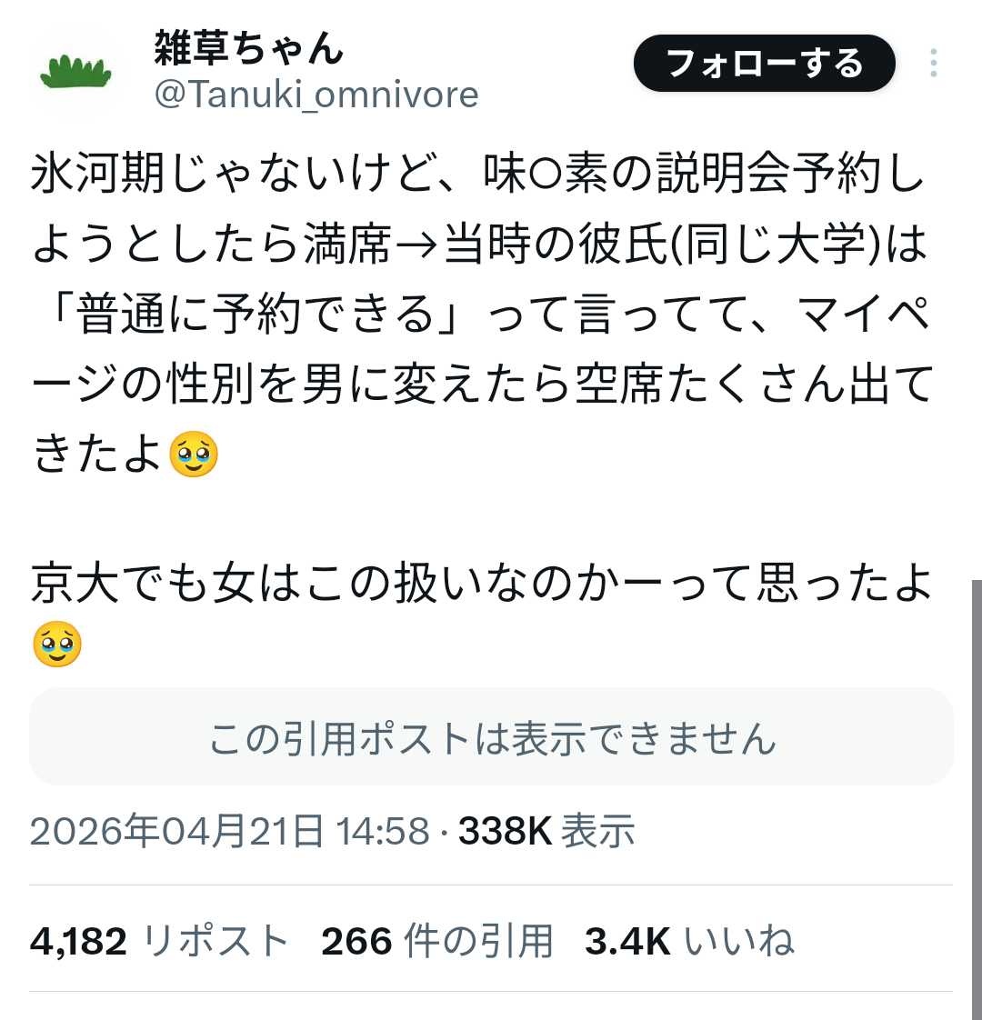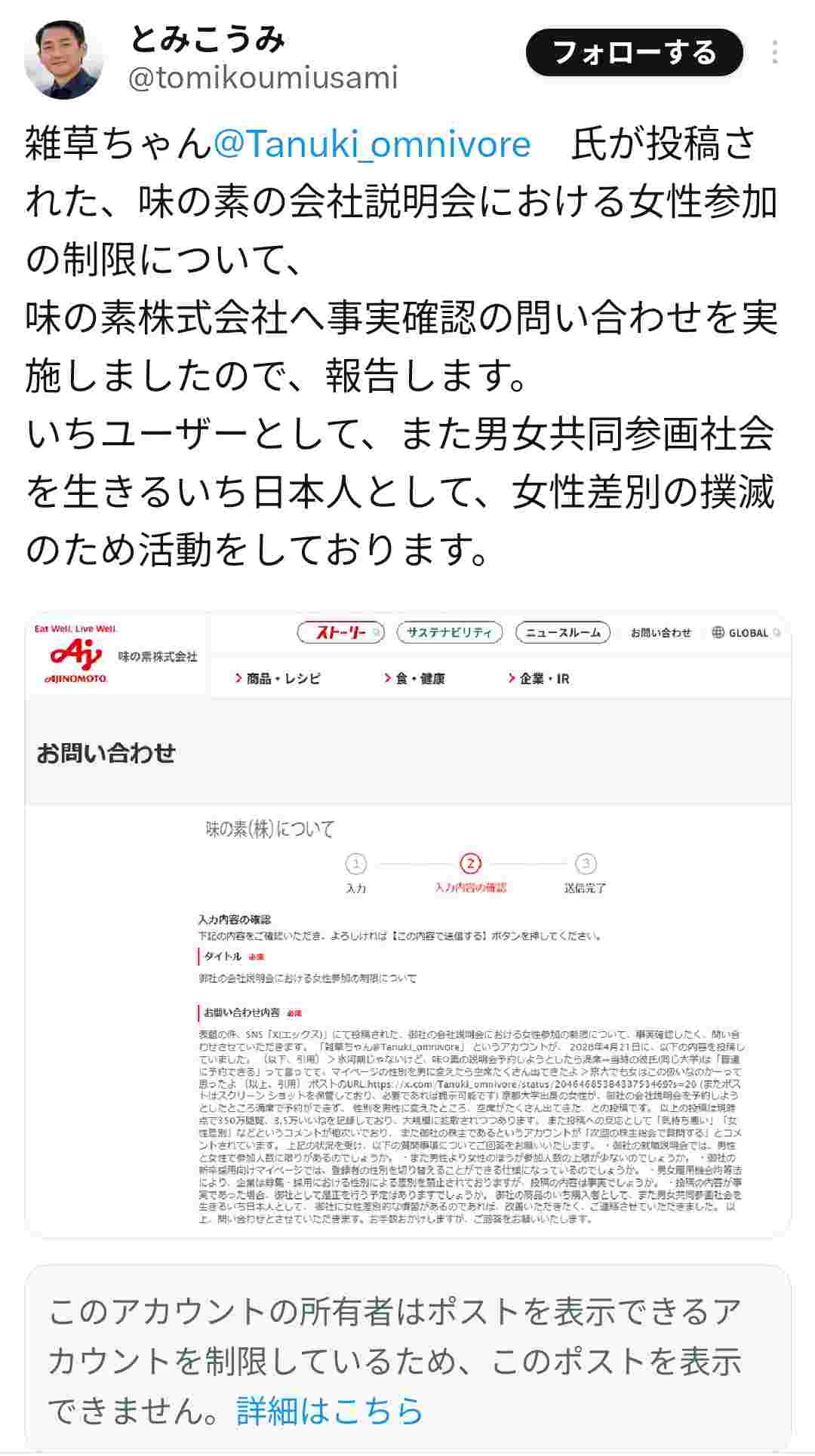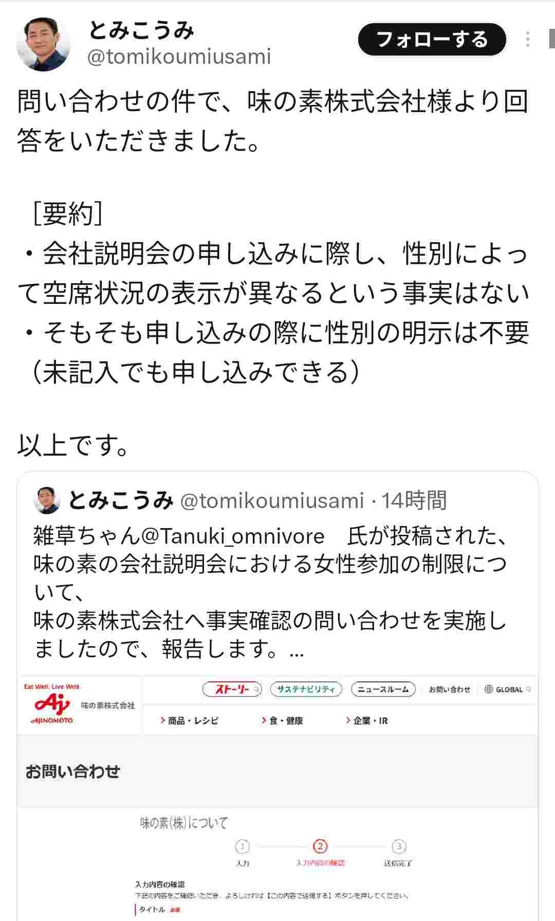 フェミニスト「味の素は女性差別企業。説明会の枠を少なく設定された」味の素「そんなことしてへんけど」