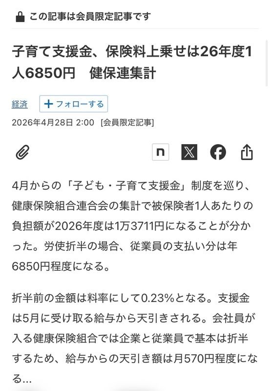 もう子供ある程度育ってこれ以上産むつもりがない家庭とか一番損やろな - 49 名前:ここからは表現の自由でイカせていただきます 投稿日時:2026/04/29(水) 11:55:52.075 ID:8sGbeuzME