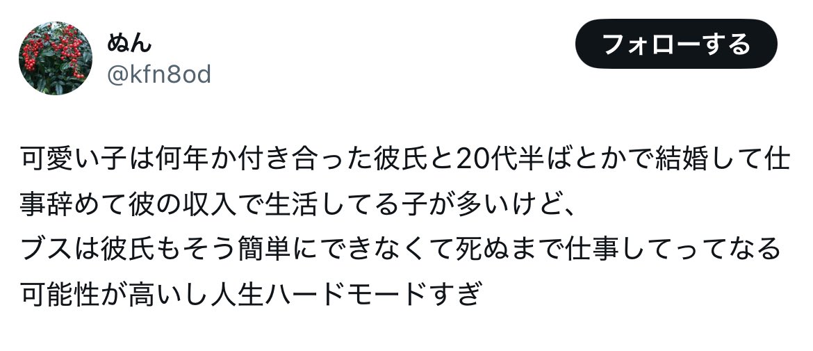 男なら彼女できないけど、女だと若けりゃ可能性があるってのは恵まれてるよな