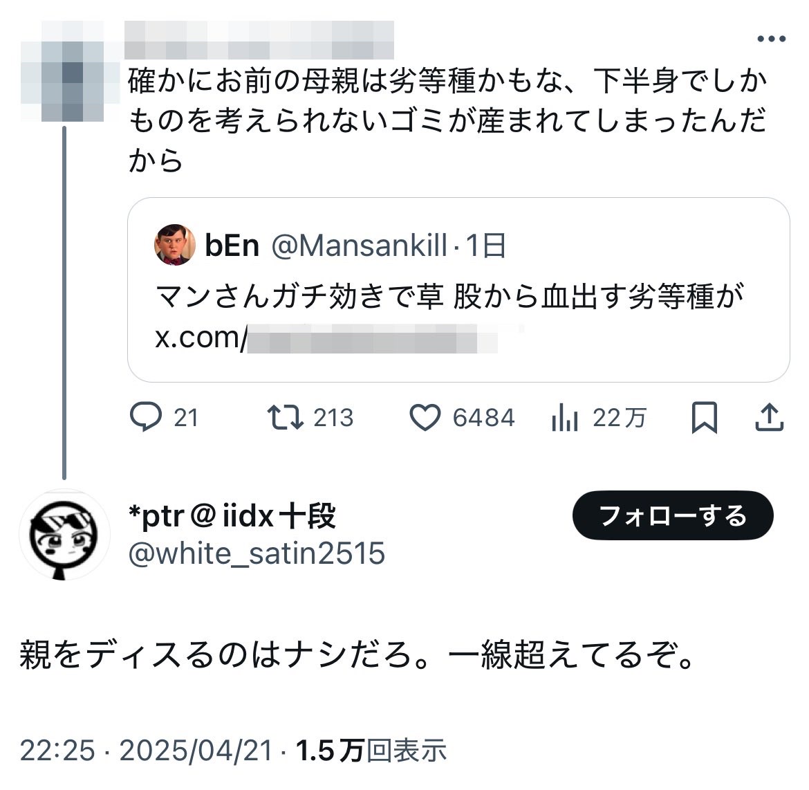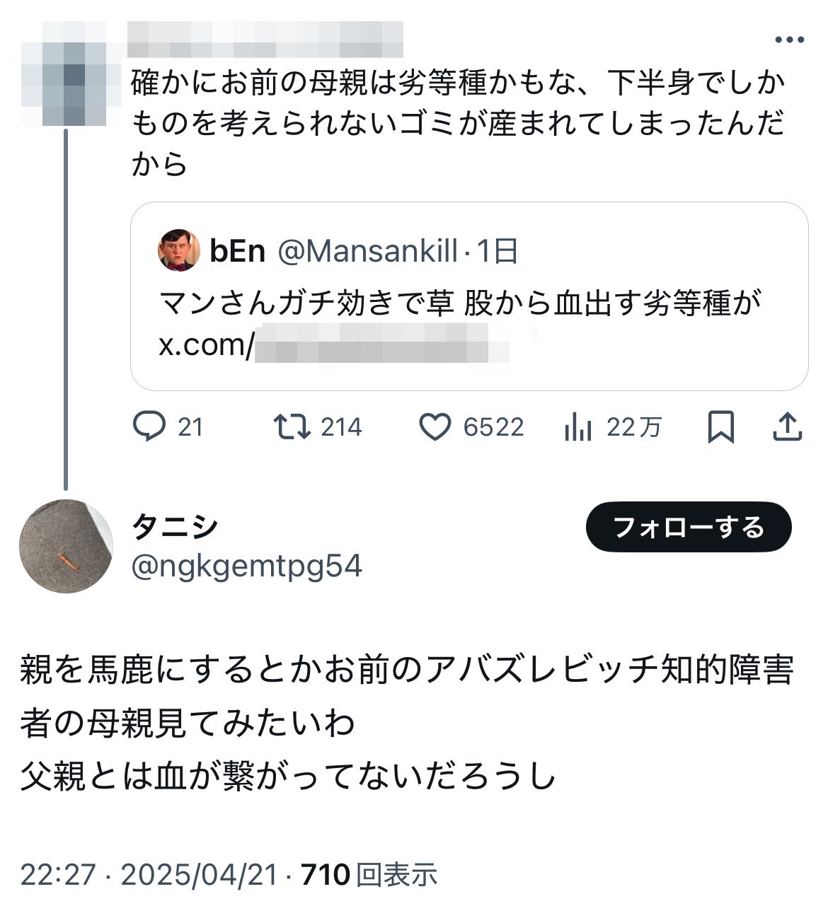ブーメランなんよ 人様の母親を侮辱するお前の親もってなるんよ、、、