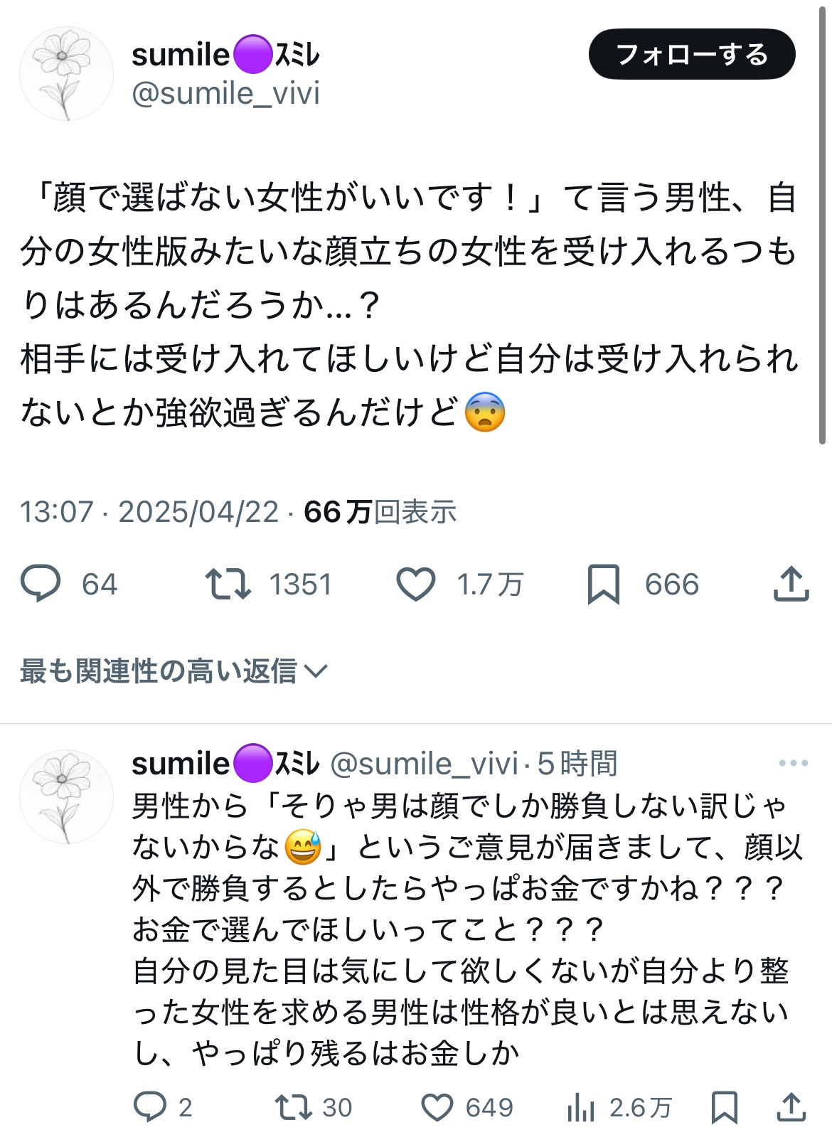 「『顔で選ばない女性がいいです!』て言う男性、自分の女性版みたいな顔立ちの女性を受け入れるつもりはあるんだろうか…?」