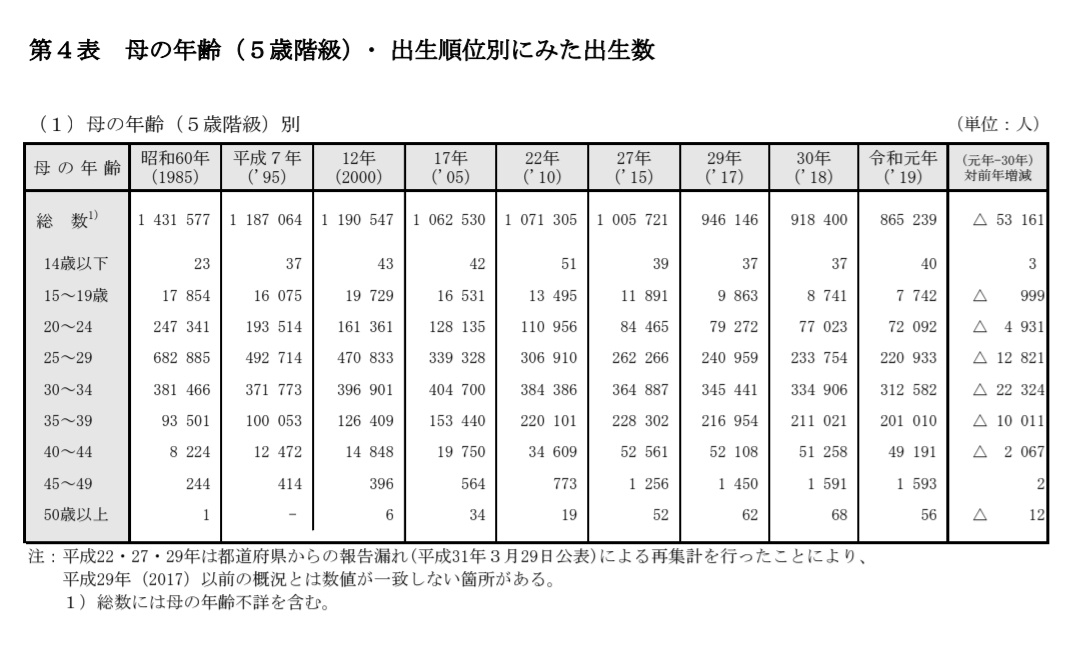 1985年と令和の出産数を比べると30代前半以下の出産数は当時より大幅に減少している