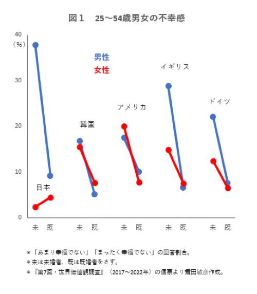 日本の未婚男性「不幸感」は他国と比べて特異的に高く女性では反対に既婚の方が高い