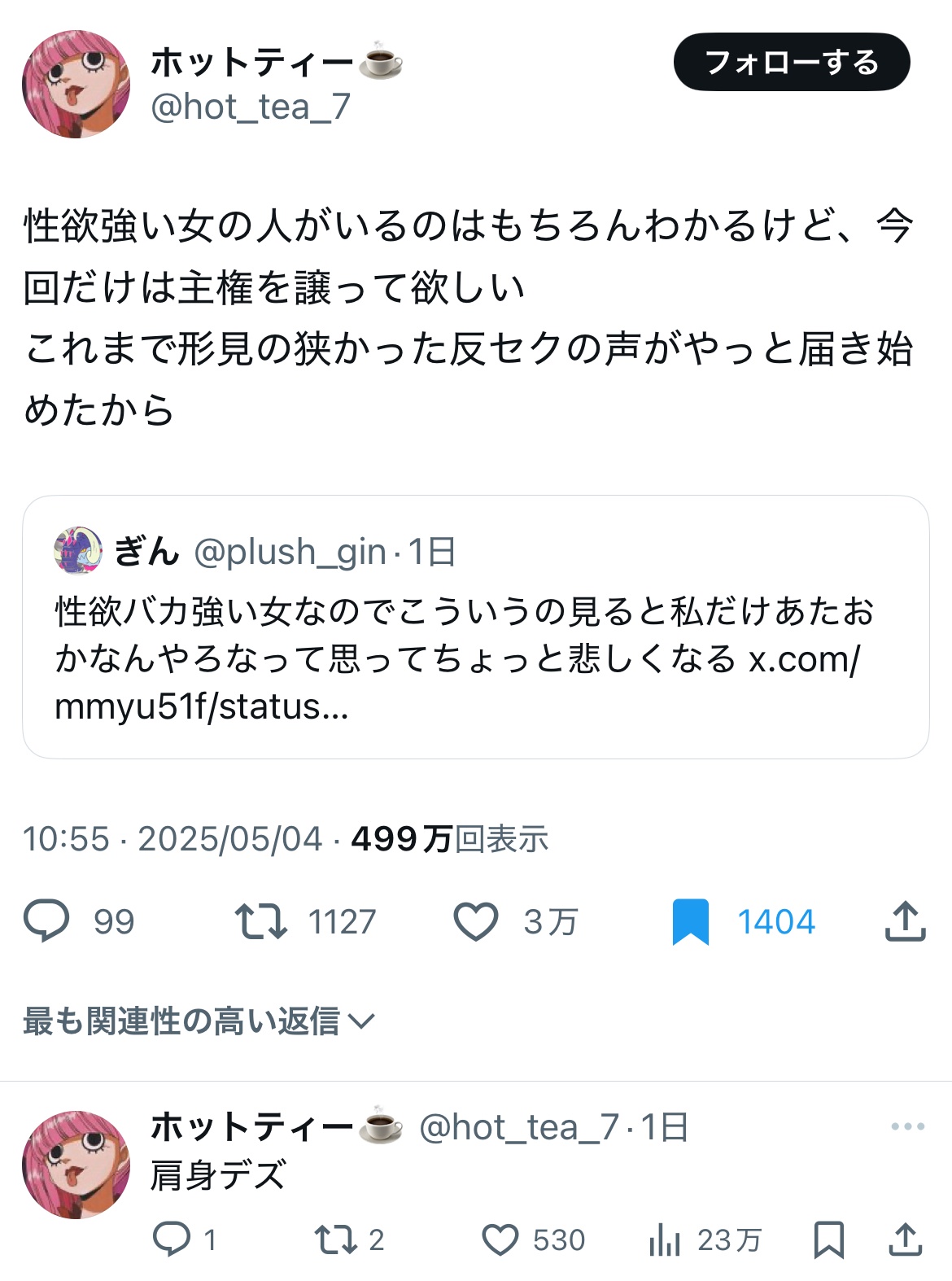 - 35 名前:ここからは表現の自由でイカせていただきます 投稿日時:2025/05/05(月) 12:20:44.45 ID:KEwtl6Aq00505