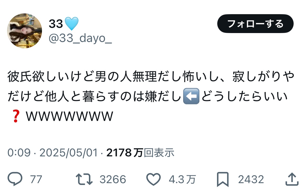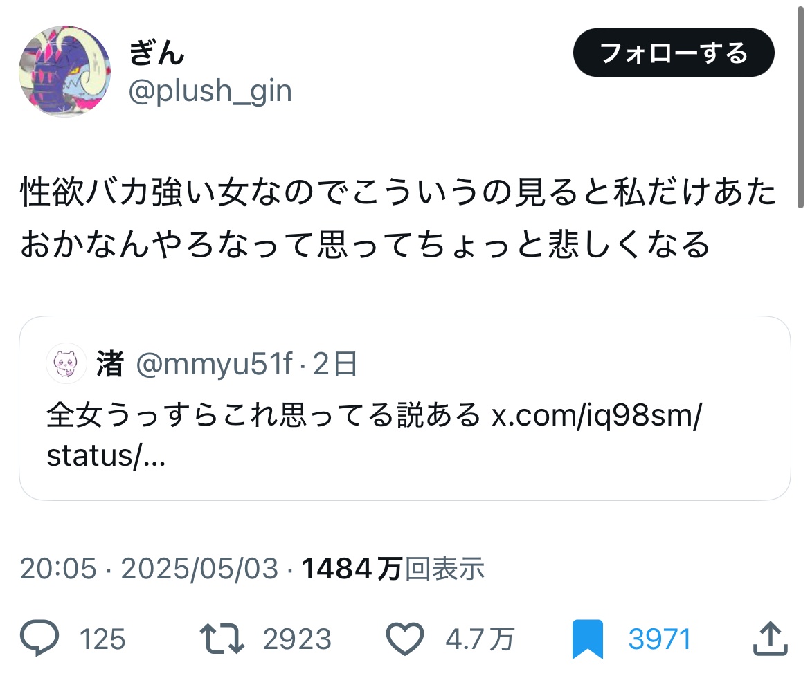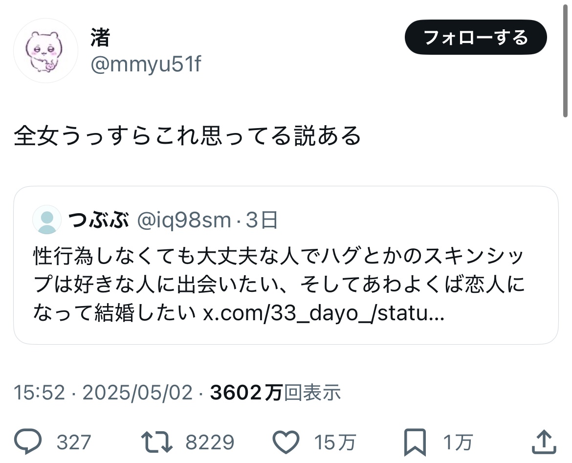 - 32 名前:ここからは表現の自由でイカせていただきます 投稿日時:2025/05/05(月) 12:20:04.24 ID:tjo5j8la00505