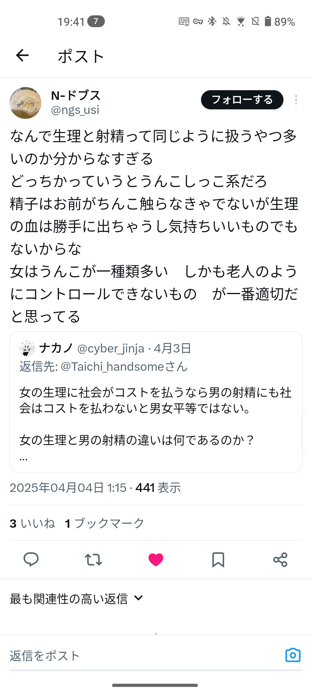 男が生理に理解が無いのは確かかもしれないけどそれを批判する文脈で自分は射精を理解してるような物言いをするのはいかにもキチゲェだな