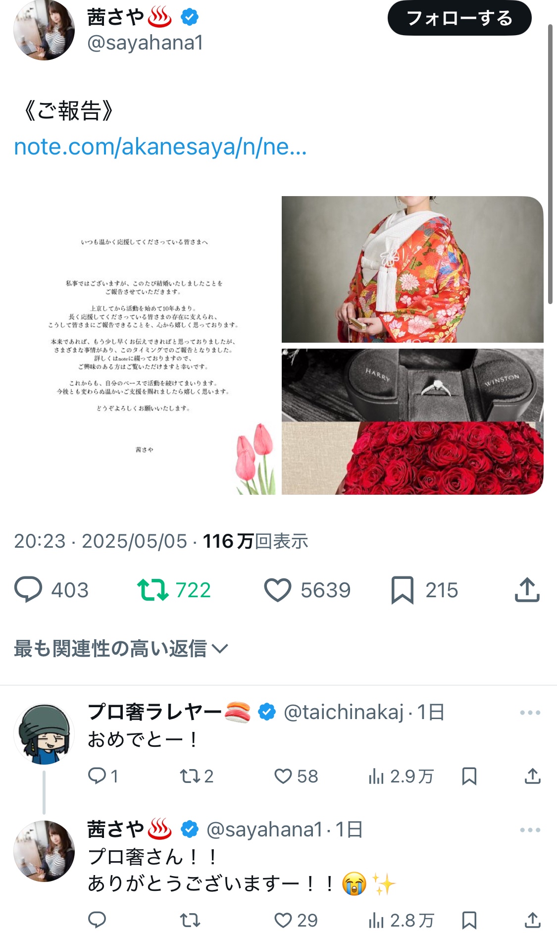 グラドルの頂点を極めた茜さや(31)、一般男性と結婚。全嫌儲民が横たわる・・・