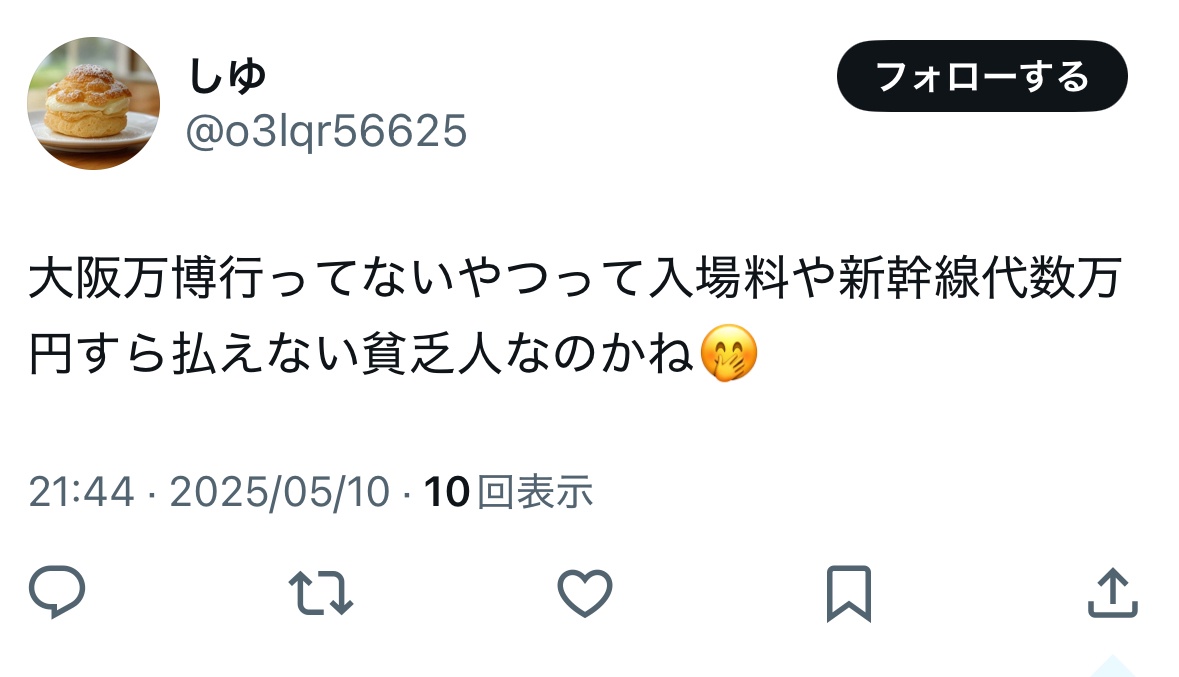 普通の男性なら数百万他の事に使いながら万博も行くけど - 9 名前:ここからは表現の自由でイカせていただきます 投稿日時:2025/05/10(土) 21:56:48.59 ID:HA2FHiWN0