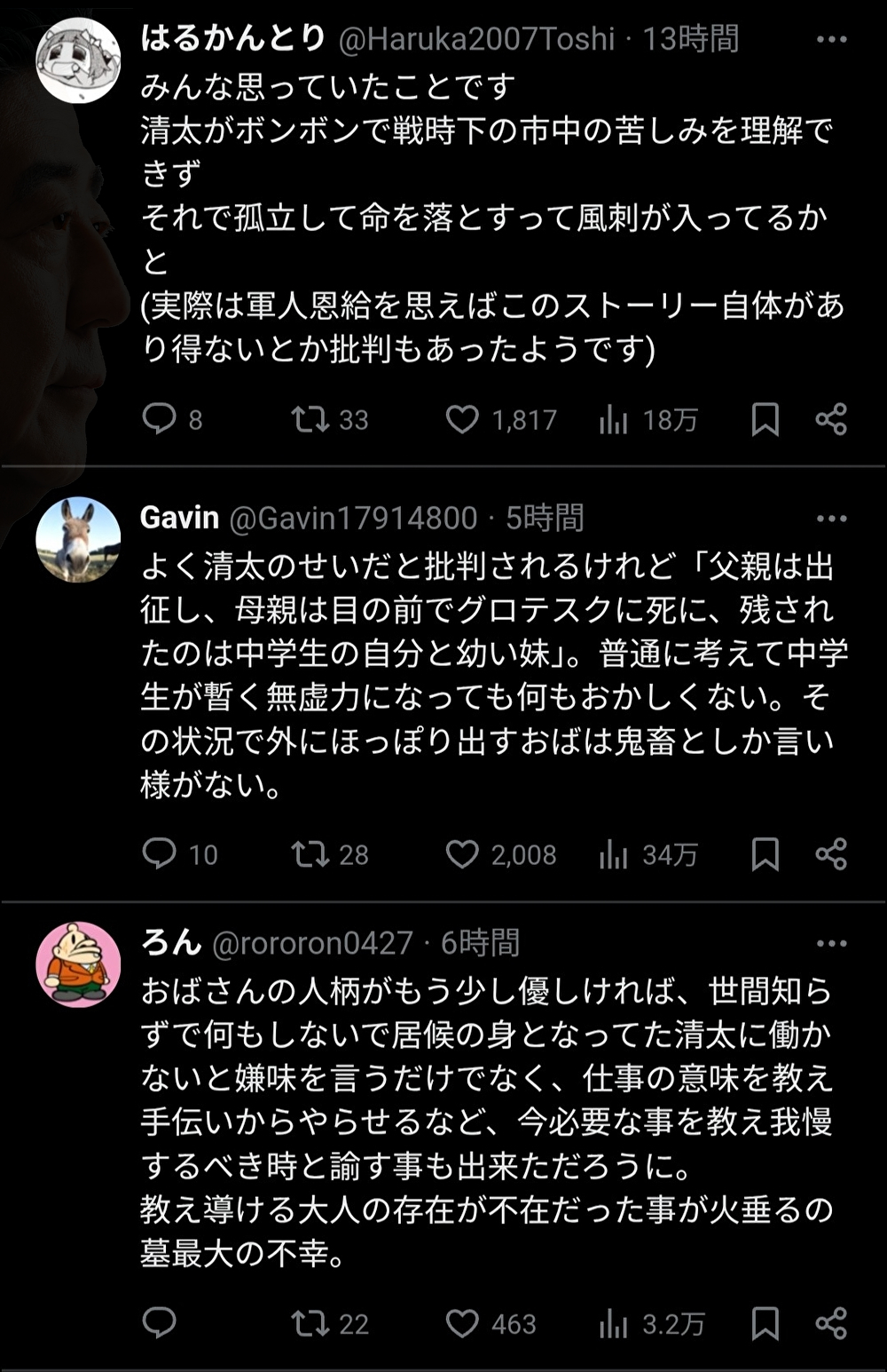 てか清太が受け取る分の遺産も食料も戦死者遺族への支援もどこ消えたんだよ
