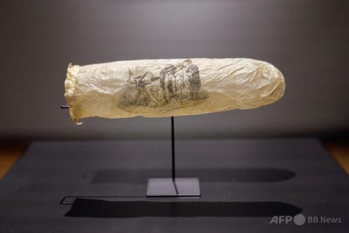 オランダ・アムステルダム国立美術館は3日、1830年ごろの貴重なコンドームを展示した。表面には、修道女1人と男性の聖職者3人が挑発的なポーズを取るエ口チックな絵が刷られている。