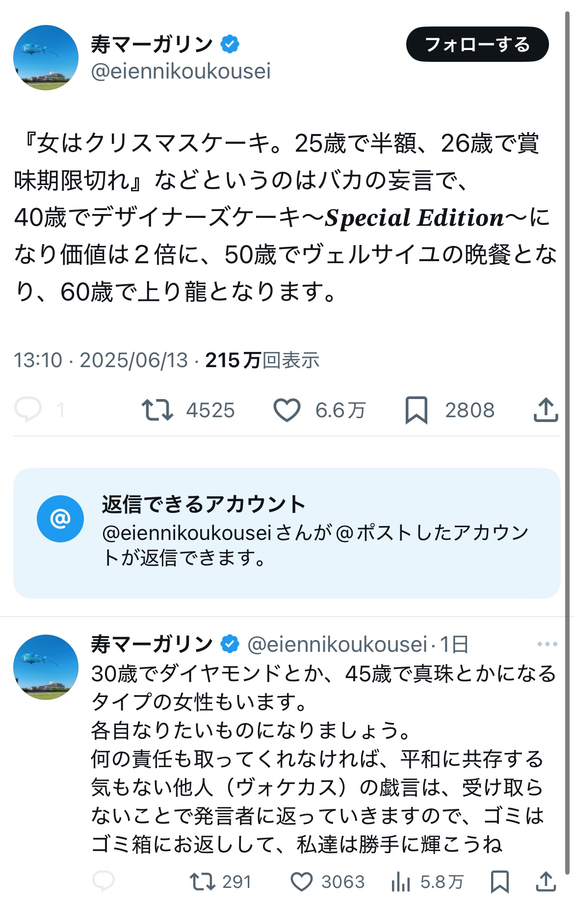 女性『女は25歳で半額、26歳で賞味期限切れ』などというのはバカの妄言で、 40歳でデザイナーズケーキになり価値は2倍に」6.6万いいね