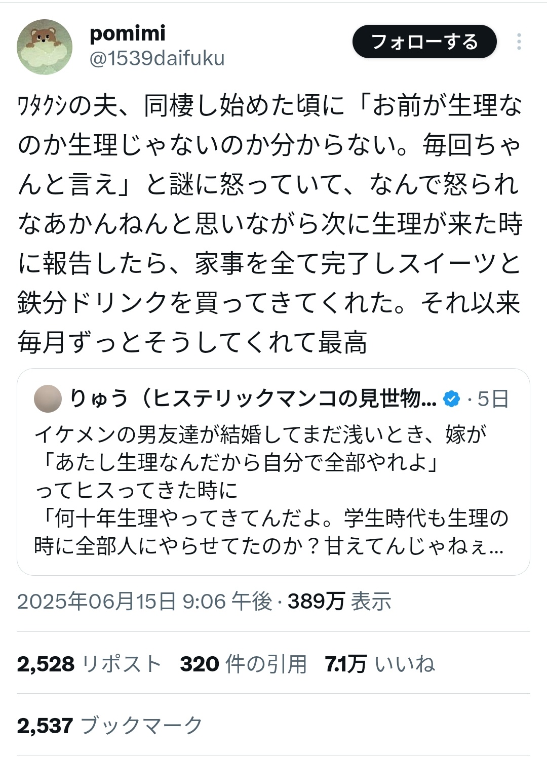 夫「生理が来たら俺に教えろ」嫁「え・・・?」→7万いいね