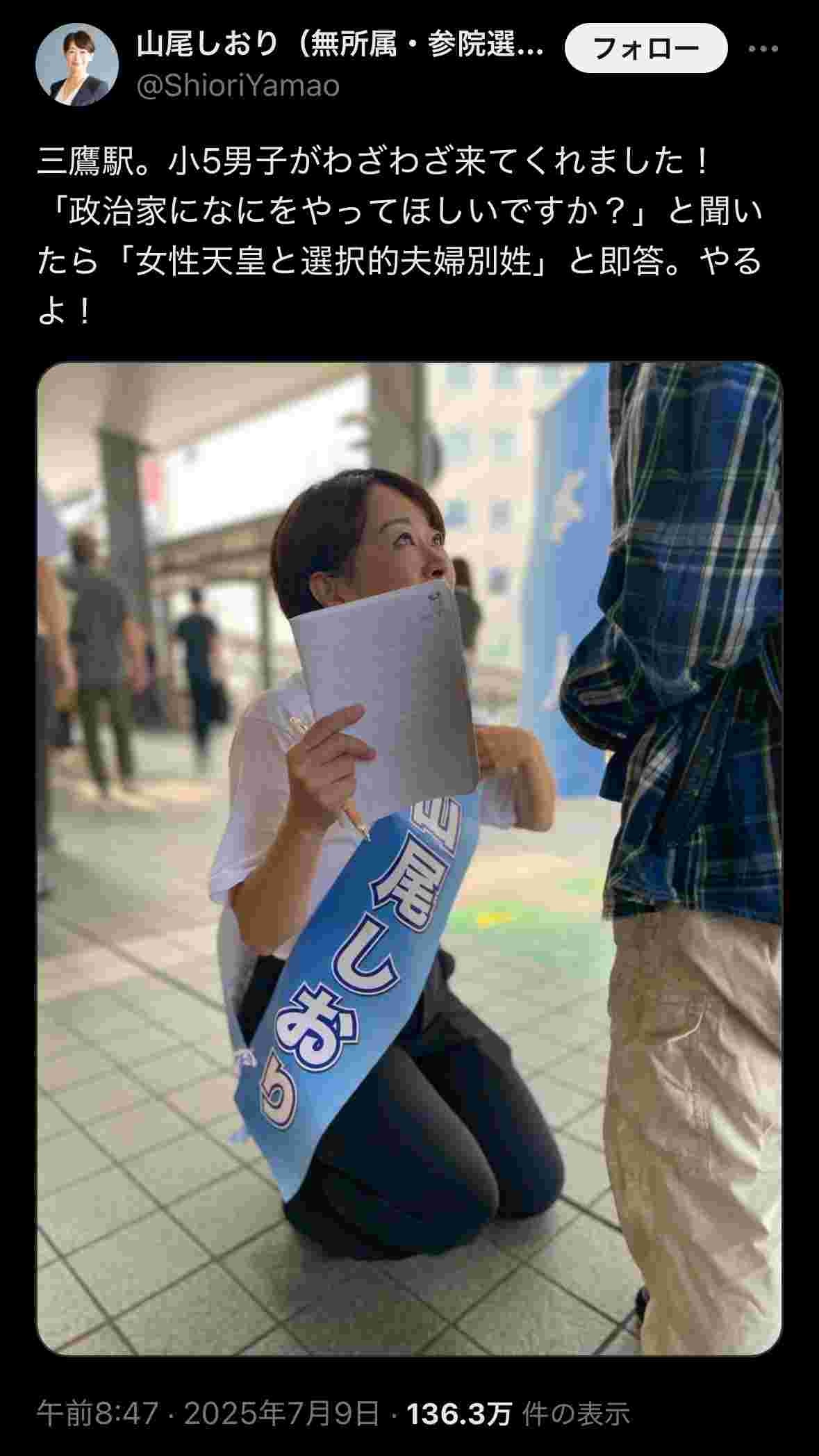 【判定】山尾しおり「小5男子がわざわざ来てくれて、政治家になったら女性天皇と選択的夫婦別姓をやって!と言ってくれました」