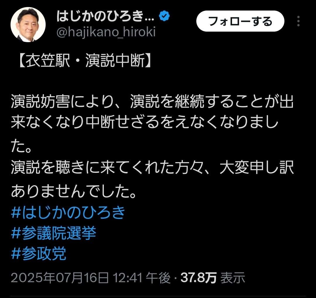 - 参政党の理想の社会だと演説妨害は重罪なんだろうな