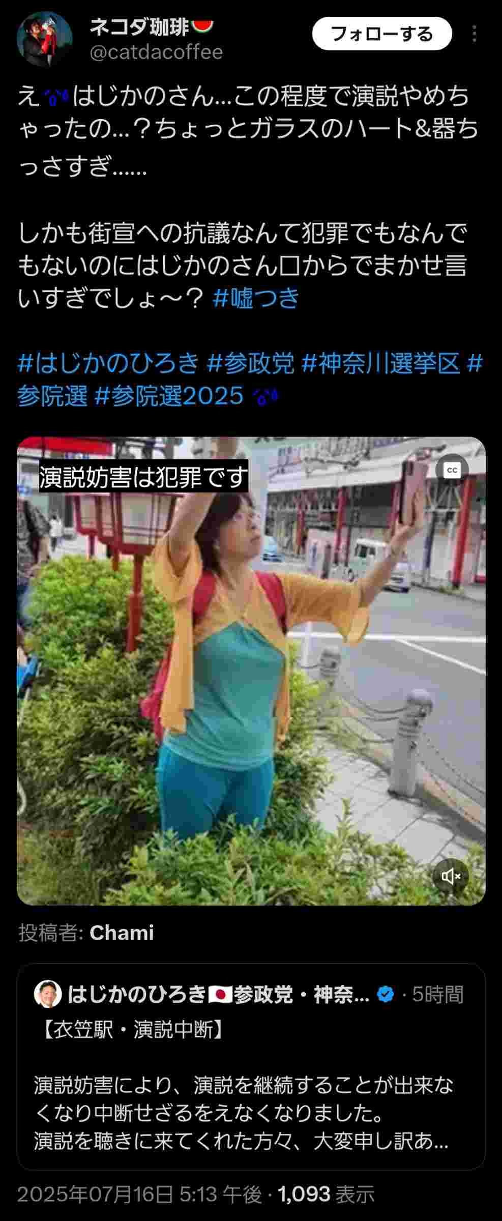 - 動画見たら、候補が「演説妨害です!おまわりさーん」とか言ってて笑った