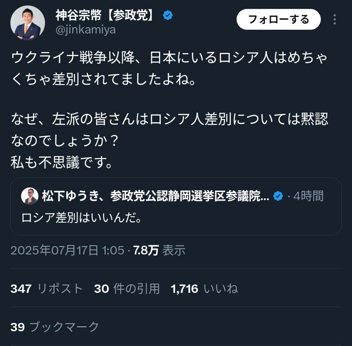 神谷宗幣「ロシア人差別をやめろ!!!(シュババババババ)」