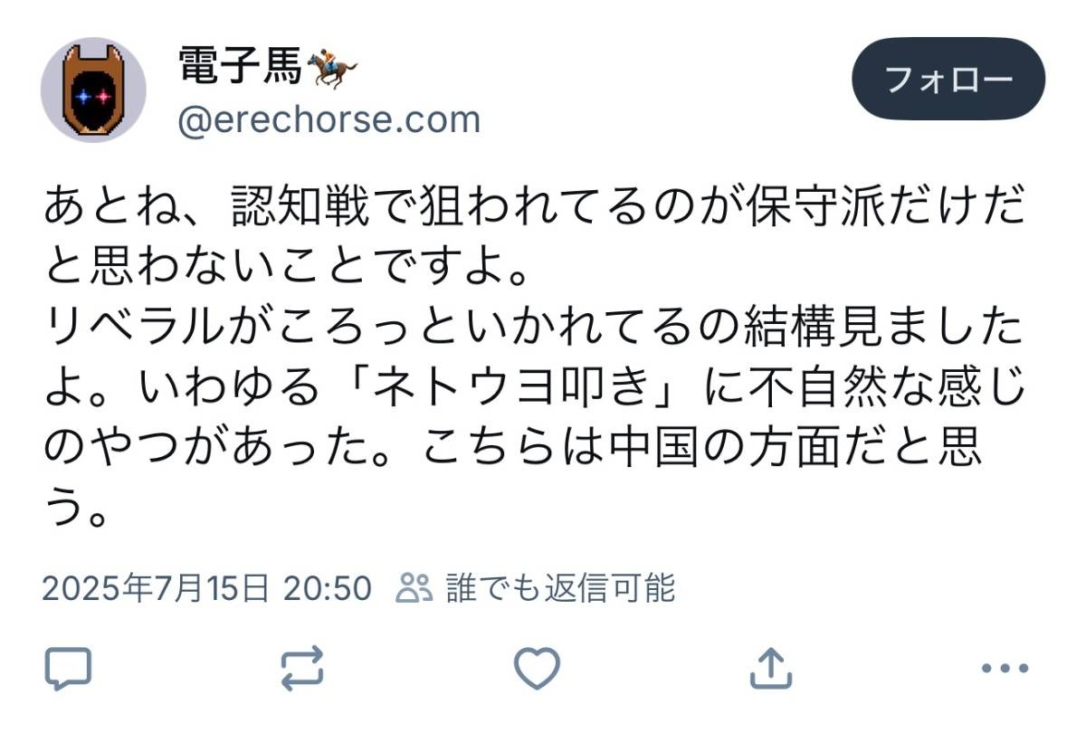 そしてネトウヨの妄想の敵に戦ってるから参政党に感情だけで支持してる脳みそ空っぽあのアホ - 9 名前:ここからは表現の自由でイカせていただきます 投稿日時:2025/07/17(木) 14:14:13.01 ID:Ry0lXbOO0