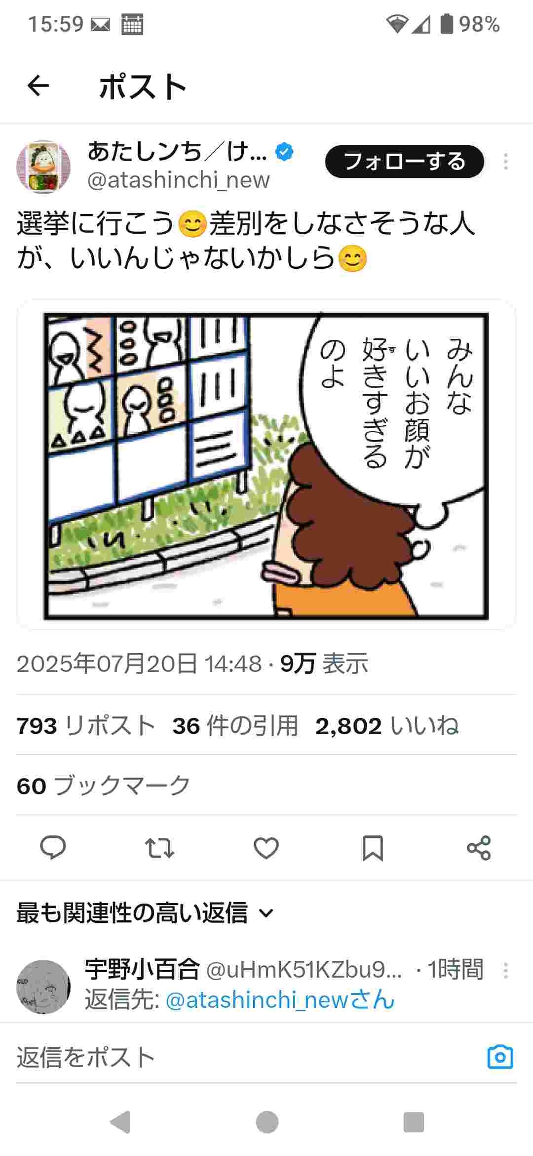 誰に投票してもいいよって言ってるだけの無難な意見ですね - 17 名前:ここからは表現の自由でイカせていただきます 投稿日時:2025/07/20(日) 16:30:28.06 ID:VQuzcJho0