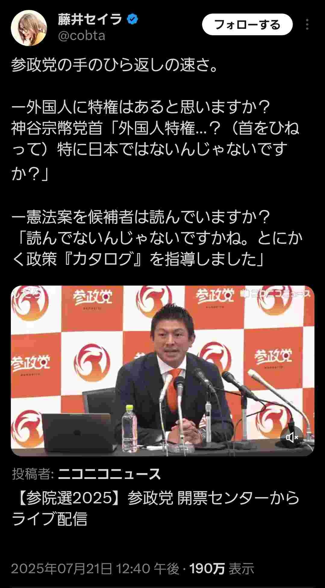 藤井セイラ【文フリ東京き-01,02】南3-4 (@cobta) on X参政党の手のひら返しの速さ。 ー外国人に特権はあると思いますか? 神谷宗幣党首「外国人特権…?(首をひねって)特に日本ではないんじゃないですか?」 ー憲法案を候補者は読んでいますか? 「読んでないんじゃないですかね。とにかく政策『カタログ』を指導しました」x.com - 2 名前:ここからは表現の自由でイカせていただきます 投稿日時:2025/07/21(月) 18:02:07.34 ID:dWJF4VqG0