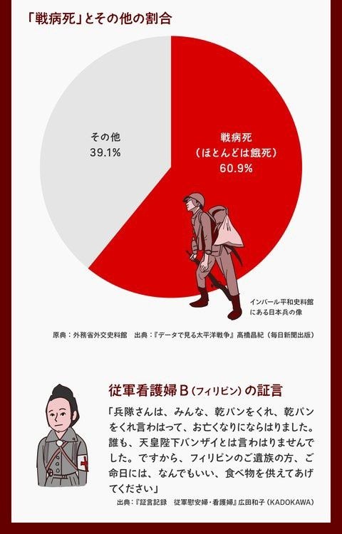 - 石破茂首相は20日夜に出演したTBSラジオの番組で、第二次世界大戦での日本軍の死者に言及し「兵隊さんで亡くなった方々の6割は戦って亡くなったわけじゃないんです。病死や餓死だったということを考えねばならんと思います。やはりきちんと過去の直視を忘れてはならんのだと思っています」と語った。