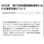 - 2025年の第27回参議院議員通常選挙において、れいわ新選組の山本太郎代表が『ガンダム』に登場する有名なキャラクターのコスプレをして演説をしたことで、「ガンダムの政治利用ではないか」とXで批判され、炎上する事態となりました。