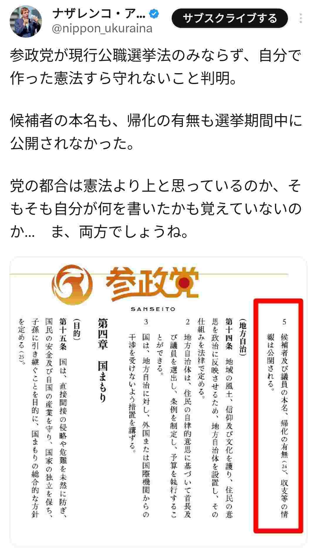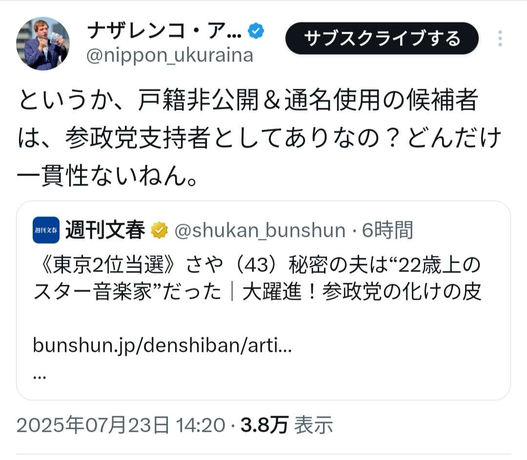 ナザレンコ、参政党・さや氏に苦言「戸籍非公開&通名使用とか自分達で作った憲法すら守れないのか」