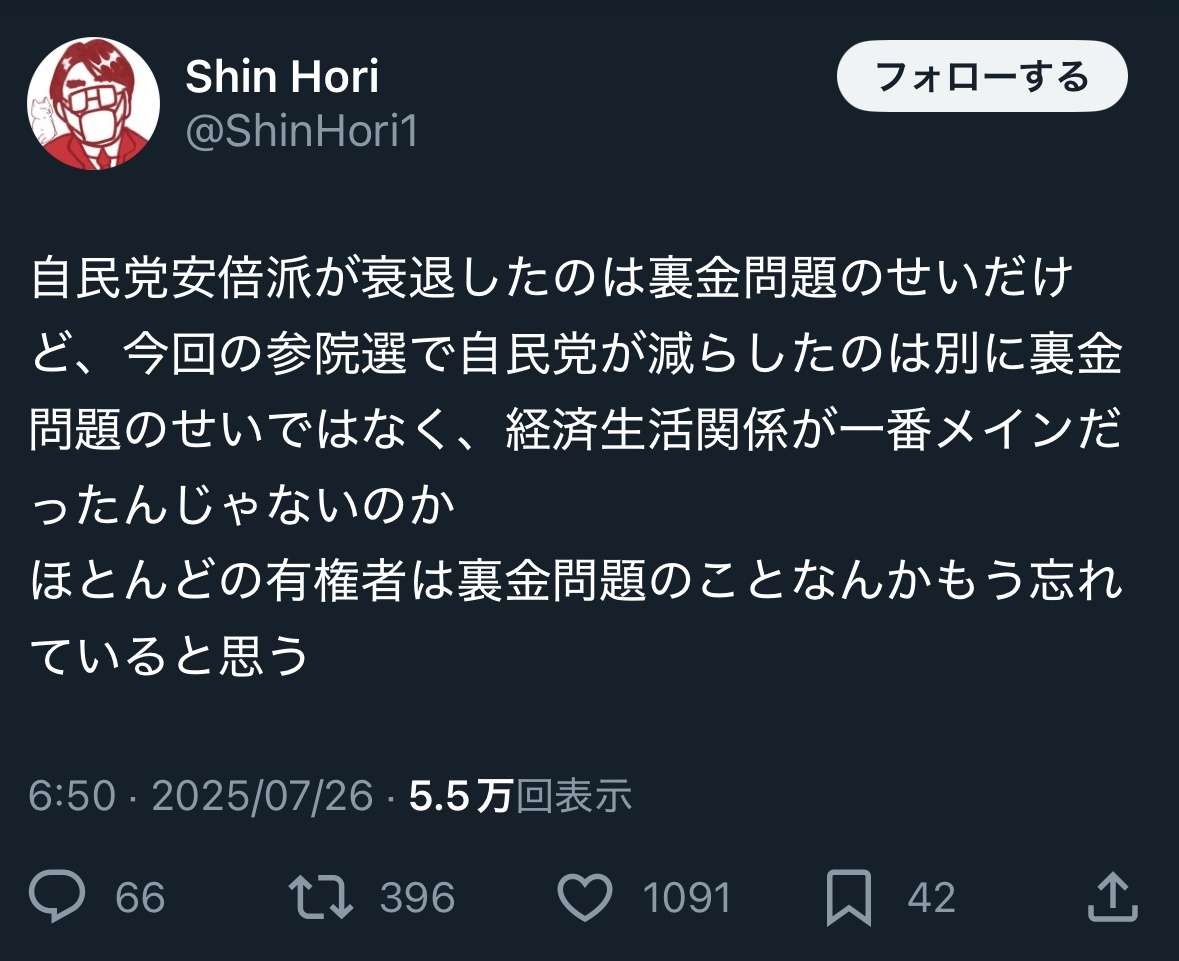 自民党安倍派が衰退したのは裏金問題のせいだけど、今回の参院選で自民党が減らしたのは別に裏金問題のせいではなく、経済生活関係が一番メインだったんじゃないのか