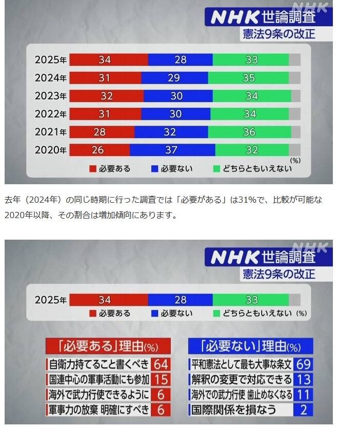 憲法9条「改正が必要」34%「改正は必要なし」28%…「改正が必要」は去年より3%アップ🥺日本、右翼化してしまう