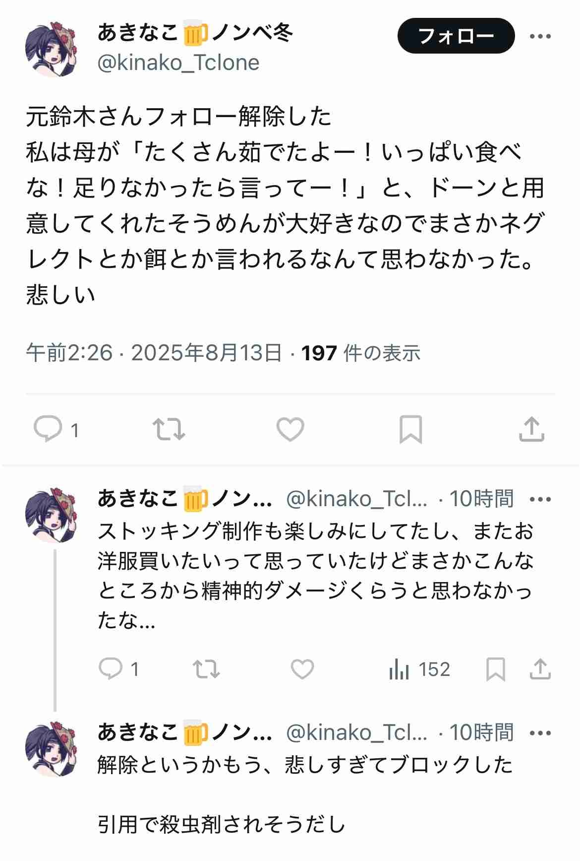 パンスト芸人元鈴木さん、うっかり素麺騒動にいっちょ噛みし弱者女性を傷付けてしまう…女の敵は女…