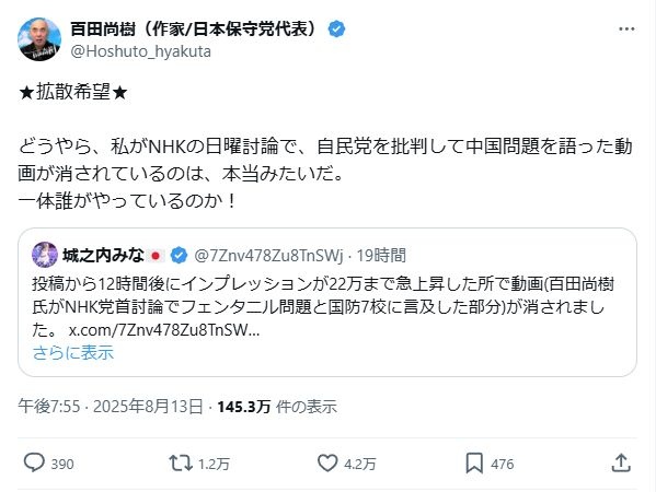 百田尚樹「NHK討論で自民党を批判して中国問題を語った動画が消されている、よほど都合が悪いようだな」