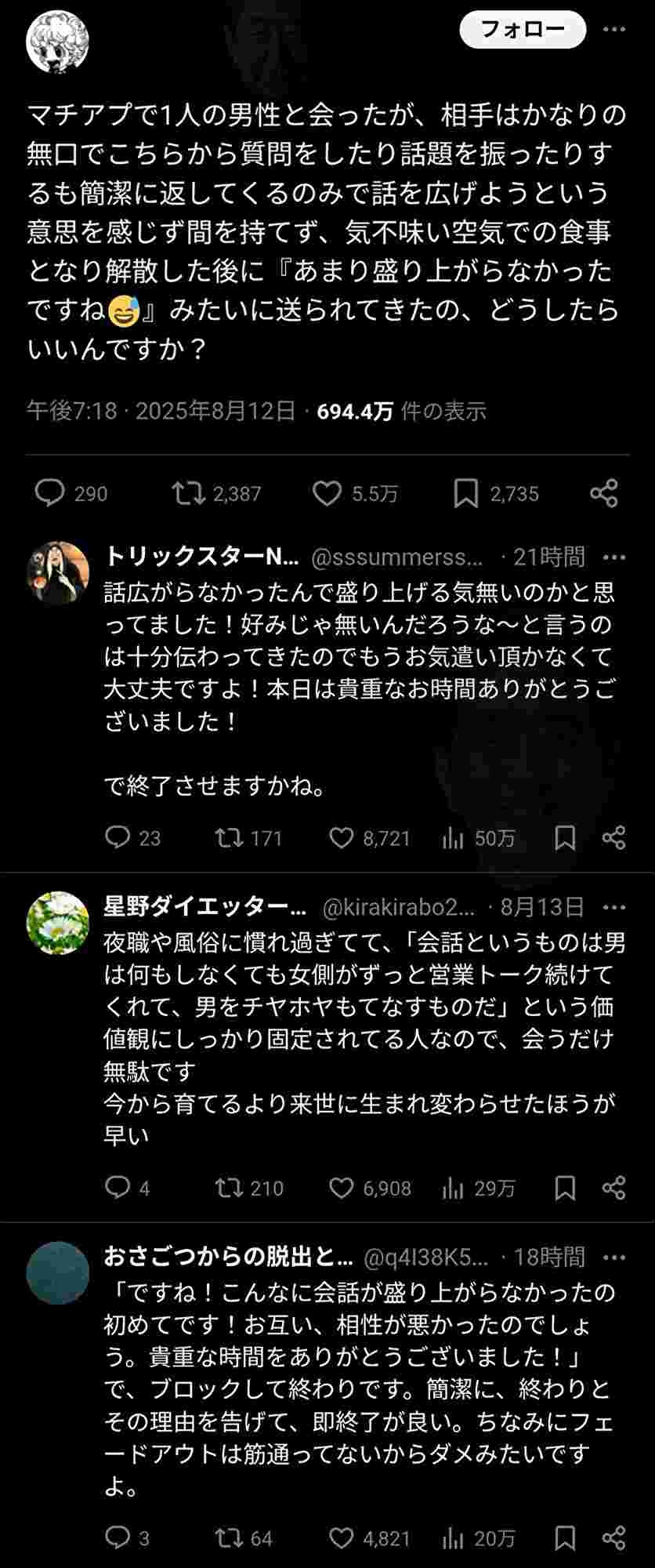- マッチングアプリで相手を探してるようなのなんてお互い余り物だしコミュ力皆無なのもままあるわな