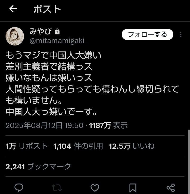 普通の日本人女子「中国人大っっ嫌い!差別主義者でも結構です!」Xで大バズリするも叩かれて垢消し逃亡