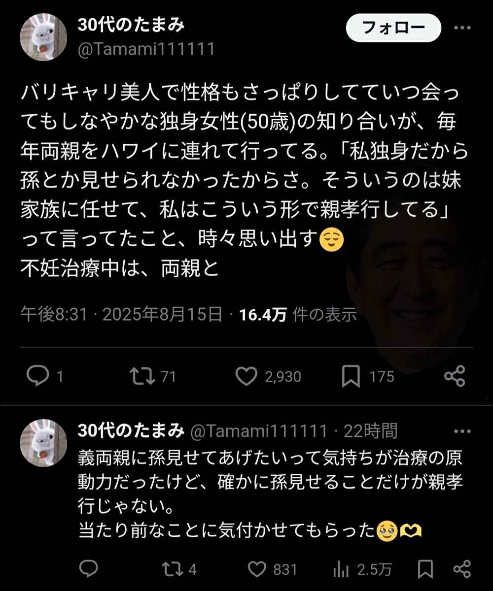 - 親は金を出せば行けるレベルのハワイより孫の顔が見たい笑