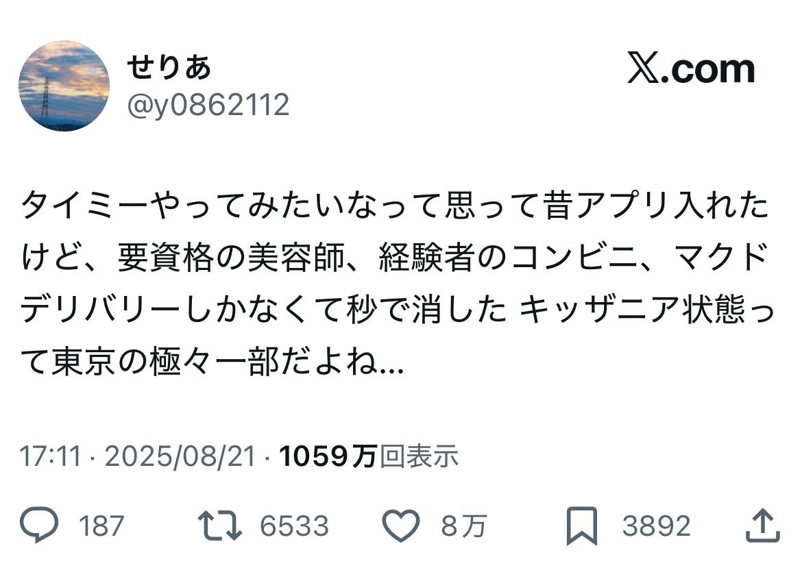 女性「タイミー、要資格、経験者限定ばっかりで全然大人のキッザニアじゃないんだけど…都心の中心部だけの話なんかな」4万いいね