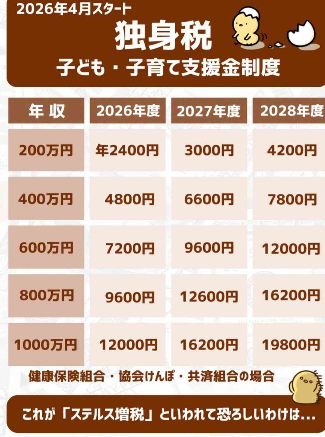 自民党、独身税本格導入へ…年収400万円2026年4800円2027年6600円2028年7800円…七対子かよ