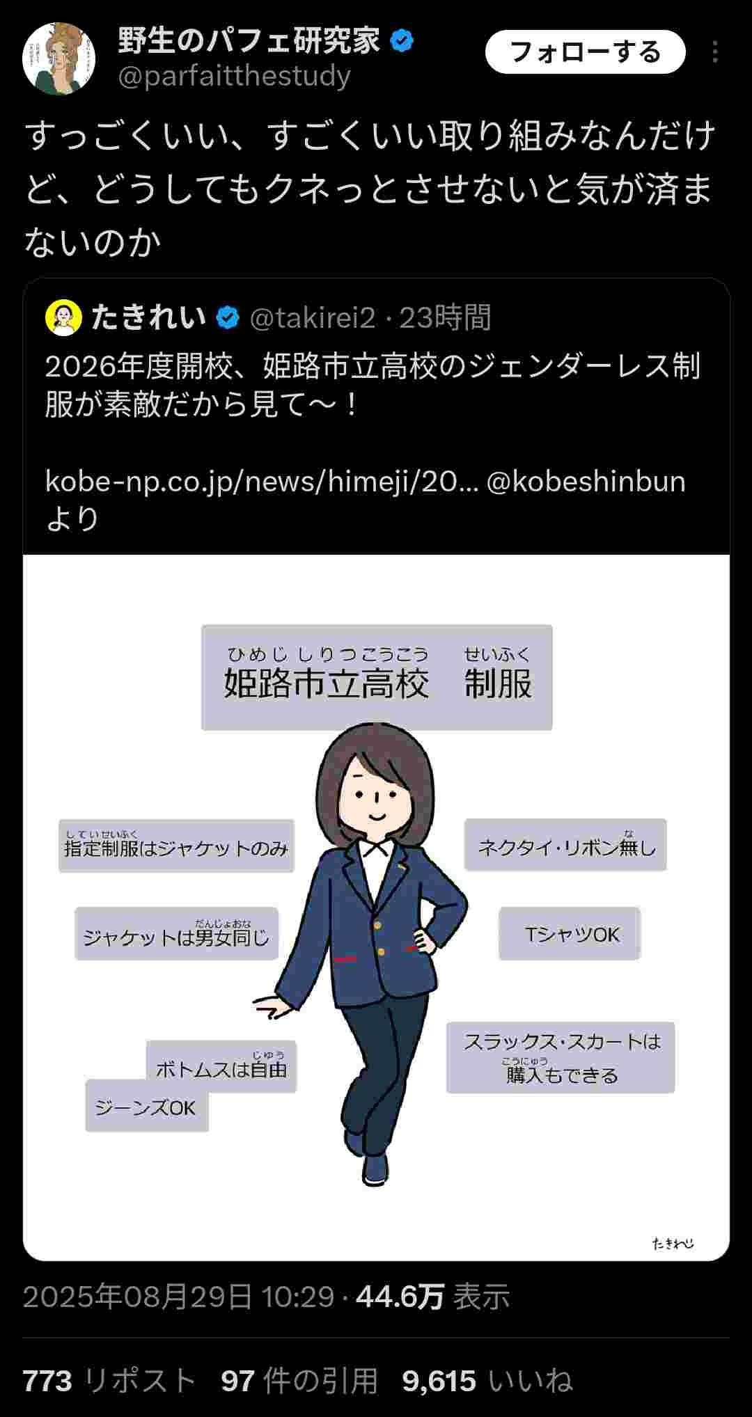 イラストレーター「姫路市立高校のジェンダーレス制服が素敵だから見て」女発狂「おんぎゃぁぁあああああ」