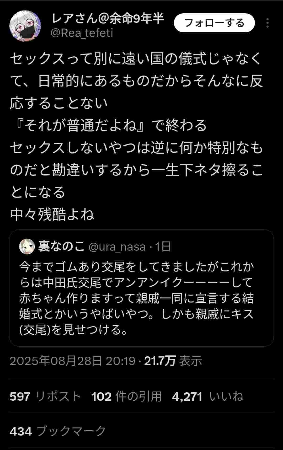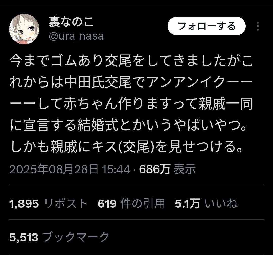 28 名前:ここからは表現の自由でイカせていただきます 投稿日時:2025/08/29(金) 17:39:22.80 ID:QG0Qcy4F0NIKU