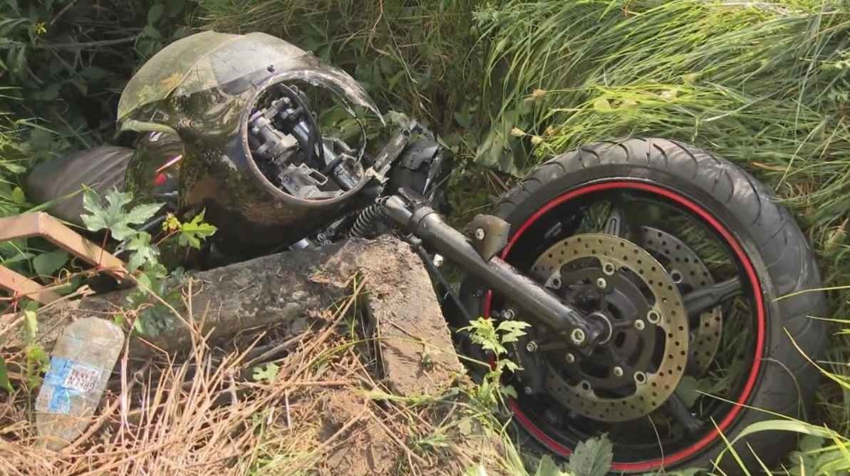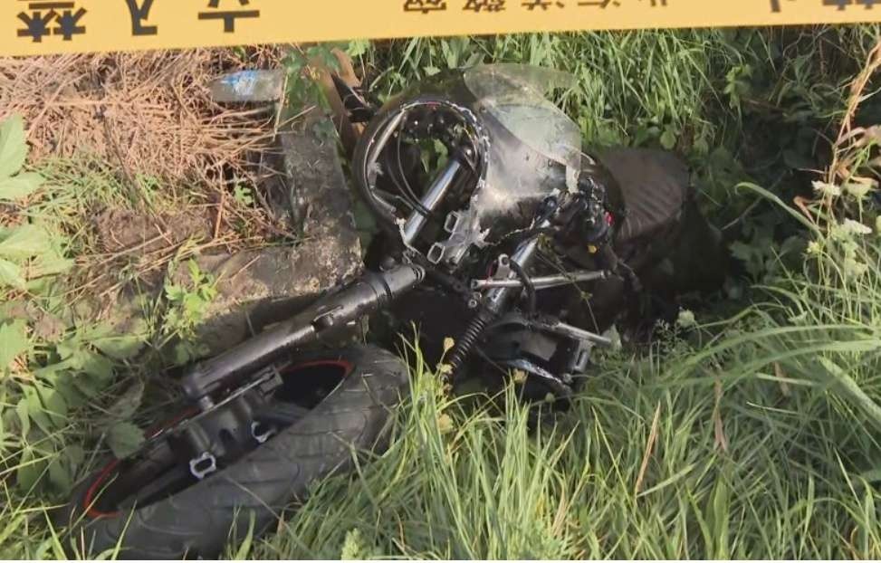 衝突の衝撃でオートバイは、フロントフォークが折れるなど激しく破損しました。