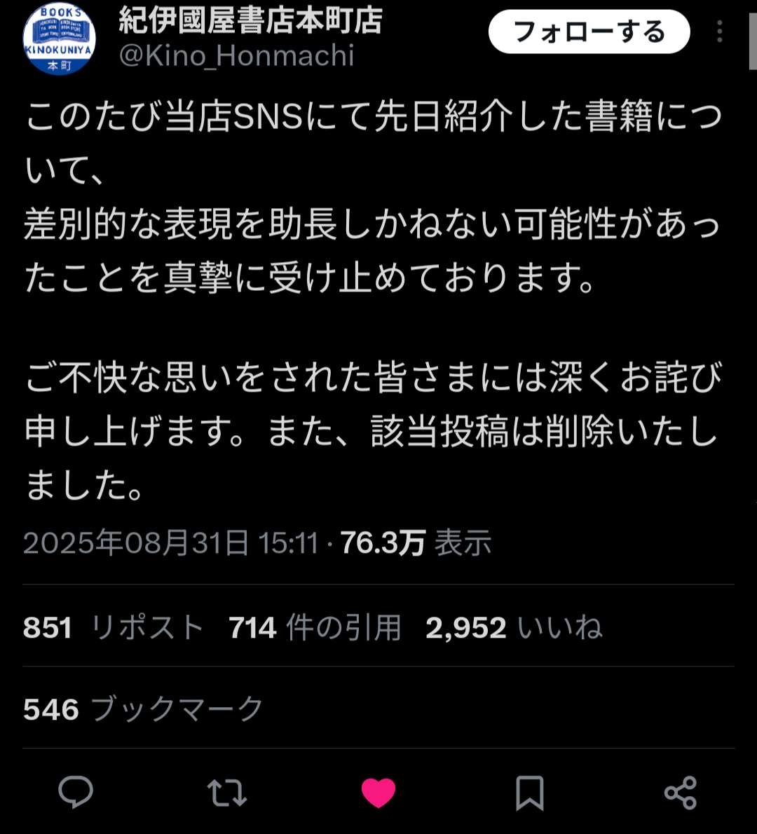 紀伊國屋書店がヘイト本をSNSで取り上げ大炎上、投稿を削除し謝罪