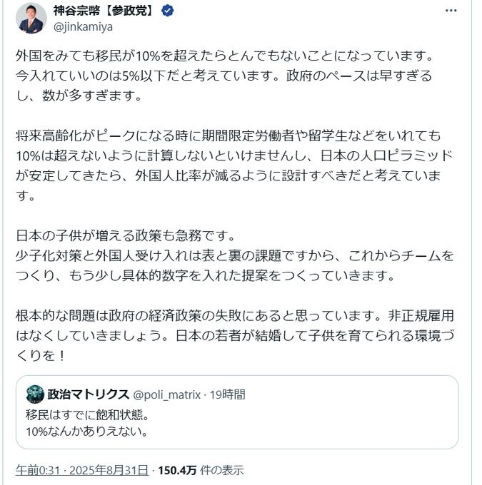 参政党神谷「移民10%を超えたらとんでもない事になる。5%以下だと考えてます。」ネトウヨ「はああああ!?」