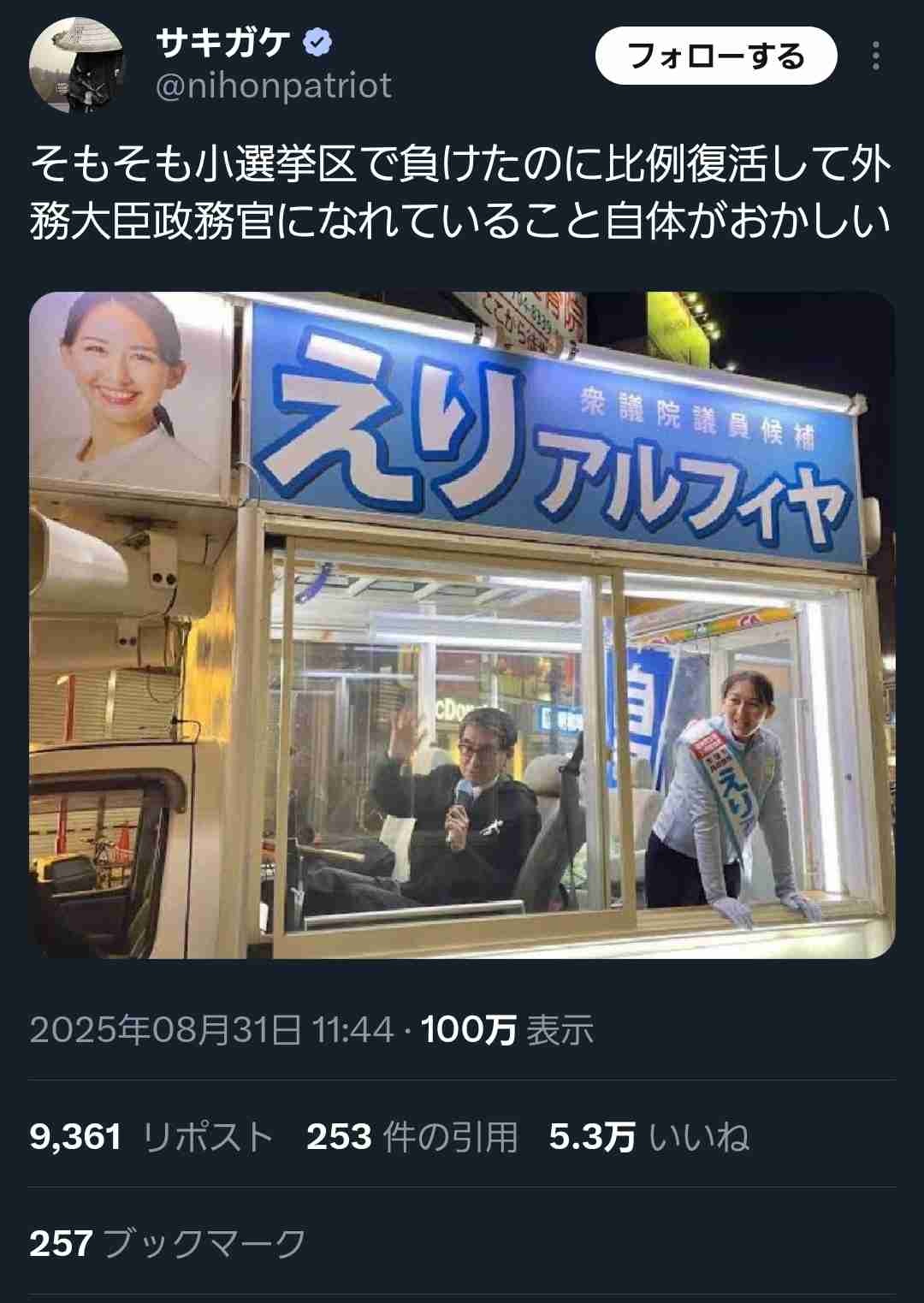 残クレアルファードみたいな名前の女、小選挙区落ちしたのに外務大臣政務官になって炎上