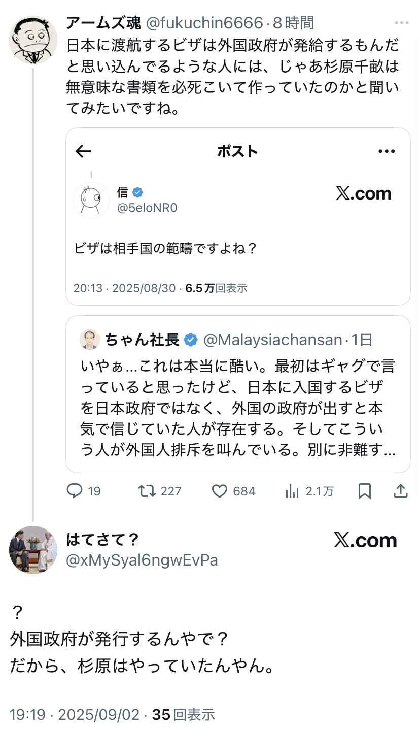 より正確には在外公館が「この人はわが国に入国する資格がありますよ」と証明した証明書 - 47 名前:ここからは表現の自由でイカせていただきます 投稿日時:2025/09/02(火) 22:07:03.91 ID:xWoteW7a0