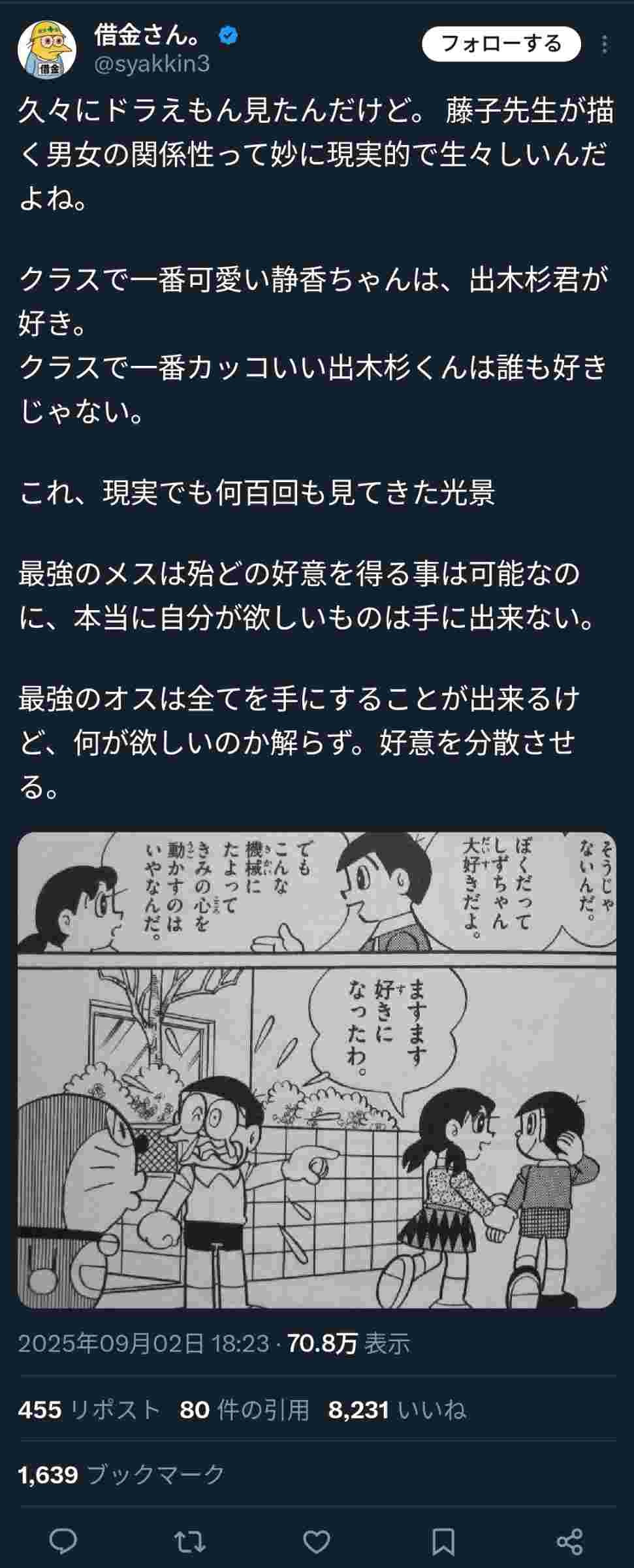 - ドラえもんってのび太が静香というトロフィーを手に入れる話なのに今も受け入れられてるの凄いよな