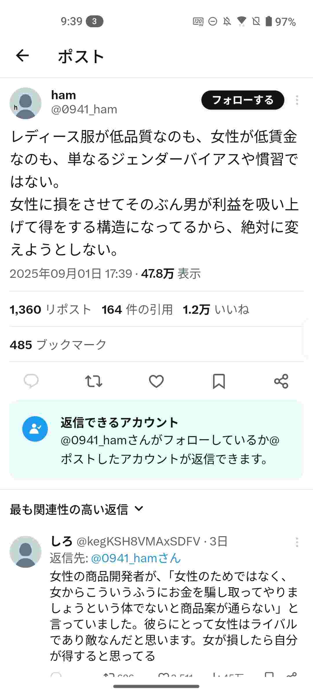 👩女性さん「女性向けのお洋服はワザと低品質に作られていて、その利益で男向けにいいもの作ってる。そういう構造がある」