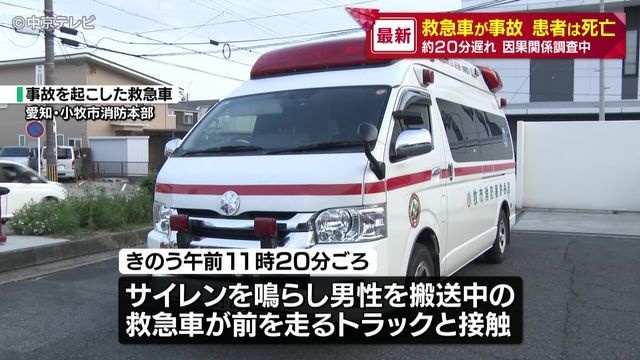 8日、愛知県小牧市消防本部の救急車が、77歳の男性を搬送中にトラックと衝突する事故がありました。男性は別の救急車で病院に搬送され、その後死亡しました。