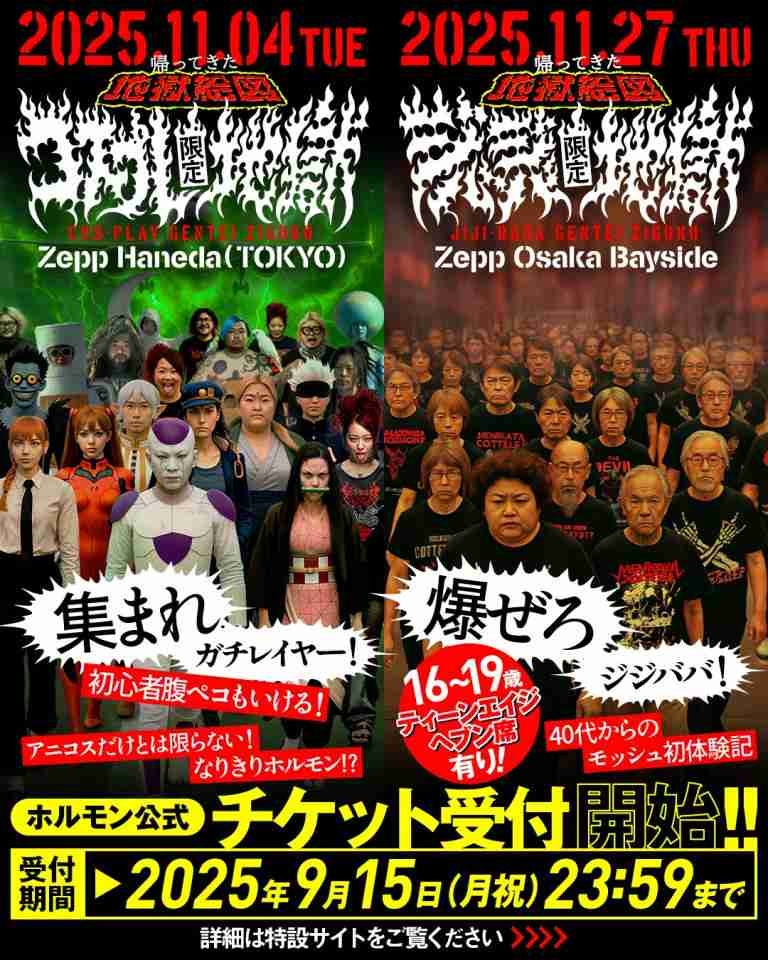 今回の復活公演では、11月4日に東京・Zepp Haneda(TOKYO)にて「帰ってきた地獄絵図~コスプレ限定地獄~」、11月27日に大阪・Zepp Osaka Baysideにて「帰ってきた地獄絵図~ジジババ限定地獄~」を開催。コスプレ限定公演は2009年8月以来、ジジババ限定公演は2008年8月以来となる。