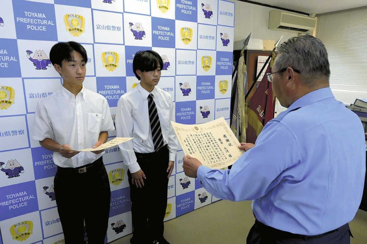車道をふらつきながら歩いていた高齢男性を救助したとして、富山県警高岡署は県立高岡商業高校2年の表龍希さん(17)、高岡向陵高校2年の 盤若 大河さん(16)に感謝状を贈った。2人は小中学校の同級生で、仲良しコンビが機転を利かせ、一人の尊い命を救った。(佐野悠太)