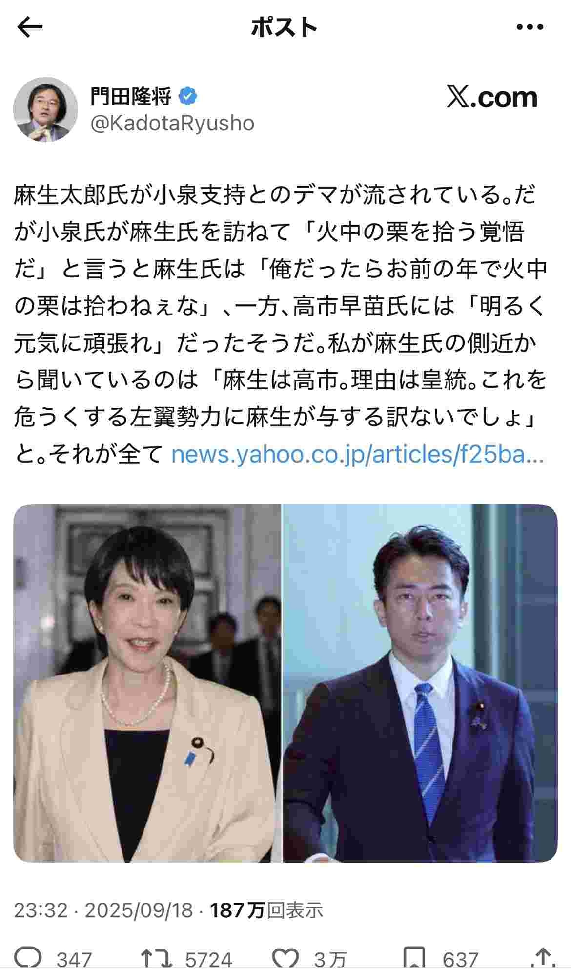 門田隆将先生「麻生太郎は高市支持、理由は皇統。自民党で小泉を支持するやつは左翼議員」