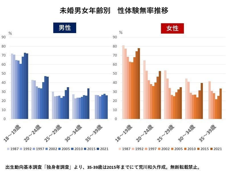 「若者のセクロス離れ」についても同様である。2021年の出生動向基本調査において、18-34歳の独身男性の「性体験無し」率は、44.2%である(ちなみに、女性は49.4%)。これだけ聞くと「そんなに多いの?最近の若い男はだらしないな」とすぐ言いたくなるおじさんがいるかもしれないが、そんなおじさんが若者だった1987年の同年齢の童貞率も43.1%である。たいした違いはない。