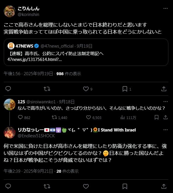 ネトウヨ「高市さんを総理にして中国に武力行使すべき!」 俺「なんでそんなに戦争したいの?」 ネ「実質もう戦争になってるだろ!!」
